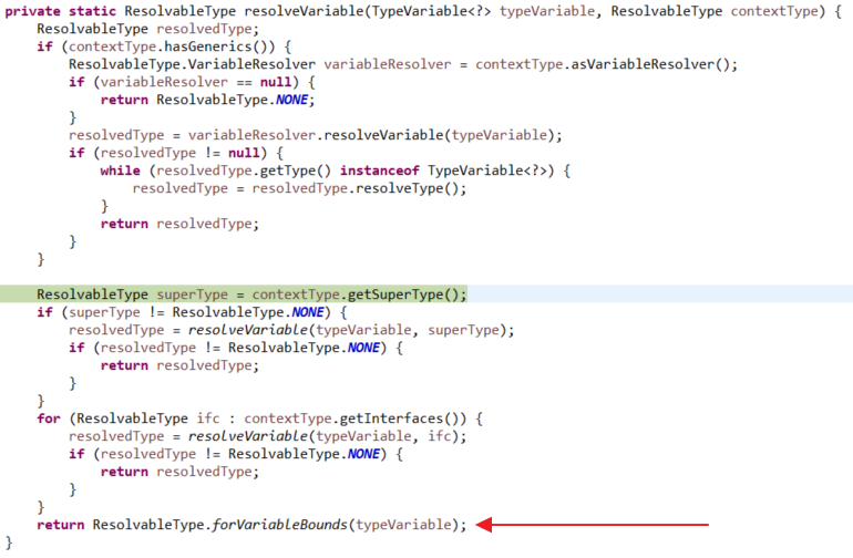 ResolvableType.forVariableBounds(typeVariable); is resolving with the generic instead of go to the parent interface to lookup the generic like before.